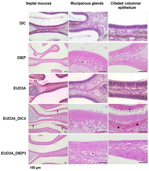 Specifically, the septal mucosa showed normal features in the mice given EUD3A, while it evidenced marked blood vessel dilatation (arrowheads) in those given DIC. The muciparous glands (central panels, asterisks) showed normal size and appearance upon treatment with EUD3A, while they are reduced in size, as occurs during secretory activation, upon treatment with DIC; membranes of mucus and shed epithelial cells can also be seen within the nasal cavities (arrows). The ciliated columnar epithelium showed normal features upon treatment with EUD3A, while it displayed rarefication of cilia upon treatment with DIC.