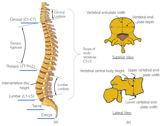 - Busscher, I.; Ploegmakers, J.J.W.; Verkerke, G.J.; Veldhuizen, A.G. Comparative anatomical dimensions of the complete human and porcine spine. Eur. Spine J. 2010, 19, 1104–1114. [Google Scholar] [CrossRef] [PubMed] [Green Version]