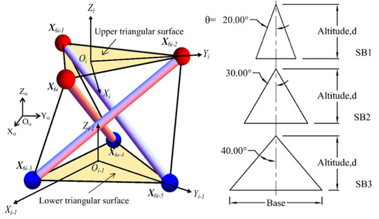 The SB1, SB2 and SB3 models were differentiated in terms of the different sizes of triangular cells, represented by half of their triangular vertex angles (θ) with values of 20°, 30° and 40°, respectively (Figure 2). The triangular cell was chosen for the spine biotensegrity models due to its simple geometry. All of the SB models have the same magnitude of triangle altitude, d, which was characterized by the vertebral end-plate width of the vertebrae. The spine biotensegrity model is made up of four triangular cells which are stacked on each other. Each triangular cell is bounded by triangular surfaces at the lower and upper end, respectively (Figure 2). In total, there are eight triangular surfaces in the spine tensegrity model: one at the base, two at each of the three apices and one at the top. Figure 2 shows the geometry of a triangular cell in the global Cartesian coordinate system Oo-XoYoZo. The position vector of nodal coordinates is denoted as X. The origins of the local Cartesian system Oi−1-Xi−1Yi−1Zi−1 and Oi-XiYiZi are positioned at the centroid of the lower (X6i-5 X6i-4 X6i-3) and upper triangular surfaces (X6i−2 X6i−1 X6i) of ith (i = 1, 2, …, 4) triangular cell, respectively. Each spine biotensegrity model consists of sixty-nine elements (i.e., twelve struts and fifty-seven cables). Details and the form-finding strategy of the self-equilibrated human spine biotensegrity models can be found in Oh, Choong, Nishimura and Kim [5]. Figure 3 shows the model of spine biotensegrity used for shape change analysis in this study. The topologies, material properties and configurations of these models are shown in Table A1 and Table A2.