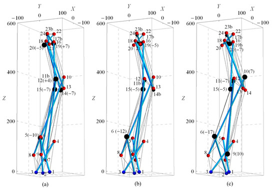 The proposed algorithm is applied to three spine biotensegrity models (i.e., SB1, SB2 and SB3) with cases of target displacement in uni-, bi- and tri- directional modes. In the uni-directional mode case, a single degree of freedom (x, y or z) of the monitored nodes is prescribed (Figure 5a), with the series denoted as Xn, Xp, Yn, Yp, Zn and Zp. In the bi-directional mode case, both the coordinates of the x and y directions of the monitor nodes are prescribed (Figure 5b), with analysis cases generally represented as XY and specifically denoted as XpYp, XnYp, XnYn and XpYn. For the tri-directional mode case, the shape change analysis cases are denoted as XY, or, specifically, XpYp, XnYp, XnYn and XpYn and then followed by Z, Zn or Zp. In the notation of analysis cases, the capital letters denote the corresponding degree of freedom where the displacement is prescribed (i.e., in x, y and z directions), and the lowercase n and p denote the negative and positive directions of the prescribed displacement, respectively. The number of analysis cases in uni-, bi- and tri- directional modes for SB1, SB2 and SB3 models are 54, 36 and 168 cases, respectively.