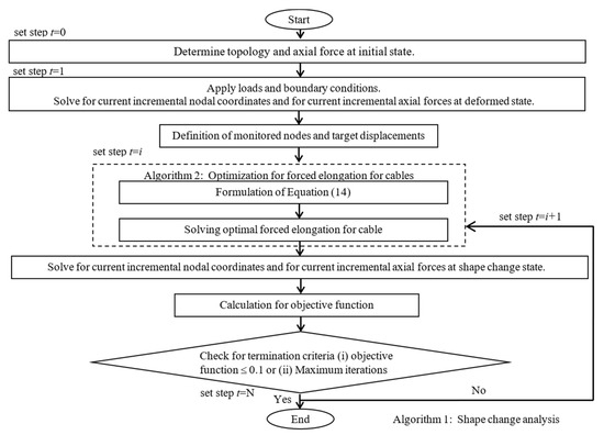 The obtained converged is then used in each incremental step of shape change analysis to determine the updated incremental nodal coordinates in Equation (11) and the incremental axial forces in Equation (12). Figure 4 shows the proposed algorithm for the shape change analysis of tensegrity.