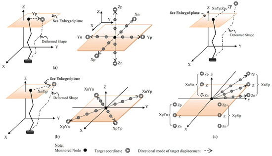 Cases of target displacements: (a) uni-directional; (b) bi-directional; and (c) tri-directional modes.