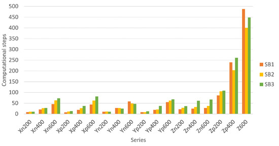 Since all SB1, SB2 and SB3 models show similar patterns for the total computational step in the tri-directional mode, only SB2 is chosen for discussion. As can be seen in Figure 8, the total computational step in series XY400 is noticeably greater than series XY200 in both series Z and Zp (i.e., Zp200, ZP400 and Zp600). When the z target displacement increases in series Zp, the total computational step increases. However, the total computational step does not depend on the x,y,z- target displacement magnitude in series Zn. The total computational step for series Zn is significantly lower compared to series Zp, and they are comparable between series XY200 and XY400. An exceptional high total computational step in XnYp200Zp400 (958) compared to other series XY is also demonstrated in SB1 (736) and SB3 (737).