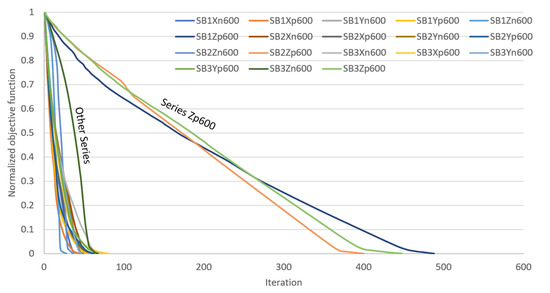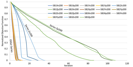 Figure 9, Figure 10 and Figure 11 show the plots of the normalized objective function (NOF) versus the iteration for 54 cases of shape change analysis with different target displacements in the uni-directional mode for SB1, SB2 and SB3 models. The NOF plots for all of the series show either linear or nonlinear patterns until reaching a plateau towards the end of the optimization process. Obvious differences in trends were noticed between the NOF plots for series Zp, Zn and the remaining series, particularly for cases with target displacements at 200 mm and 400 mm. For cases with target displacements of 600 mm, the pattern of plots for series Zp remains different from the others, while series Zn exhibits a similar NOF plot pattern to series Xn, Yp, Yn and Yp. Series Zp shows the highest iterations which are followed by series Zn and other series in most of the cases.