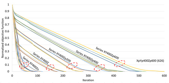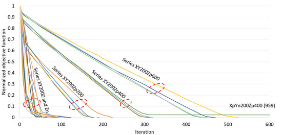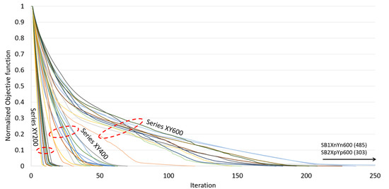 Figure 12 shows the plots of the NOF versus iteration for 36 analysis cases with different target displacements in the bi-directional mode. The convergence of NOF in a nonlinear manner was observed in all of the cases with target displacements of 200 mm (series XY200), 400 mm (series XY400) and 600 mm (series XY600). A slower rate of convergence was generally observed at the end of the optimization process. Particularly, an unusual long plateau was observed in the analysis case SB1XnYn600 (up to 485 iterations), where the NOF of this case remained at the value of 0.01 for almost 60% of the total computational step. An allowance for a 2% error in the proposed algorithm can reduce up to 66% of the total computational step in analysis case SB1XnYn600 and up to 40% for the remaining cases of target displacements with the bi-directional mode.