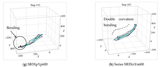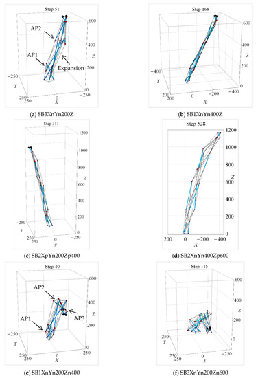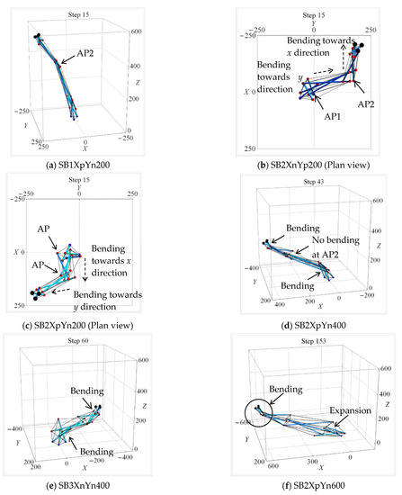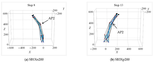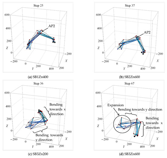 Figure 18 shows the final state for cases of shape change analysis involving the tri-directional mode. SB models in series XY200Z reach their target coordinates mainly by means of bending deformation about AP1 and AP2 (Figure 18a). On the contrary, almost all SB models in series XY400Z reach the target coordinates by means of axial deformation (Figure 18b). In series Zp, all SB models in series XY200Zp and XY400Zp reach the target coordinates by means of axial deformation (Figure 18c,d). The vertical clearance between the two groups of nodes (the upper and lower nodes) becomes significant when both x and y or z target displacement magnitudes increase.