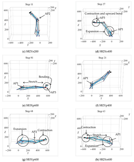 Figure 15 shows the deformed configurations at the final state for the selected cases in the uni-directional mode (series Xn, Xp, Yn and Yp). There are three apices in the spine biotensegrity models, namely, AP1, AP2 and AP3, which play a vital role as joints that permit bending. Generally, all of the spine biotensegrity models approach the target coordinates either by bending or by a combination of axial and bending deformations in cases of the uni-directional mode (i.e., series Xn, Xp, Yn and Yp). In these series, bending deformation primarily around AP2 was observed for a displacement of 200 mm (Figure 15a–c) and around all Aps (AP1 to AP3) for displacements of 400 mm and 600 mm (Figure 15d,e). However, due to the natural curvature in the YZ plane view, AP1 allows for greater bending compared to AP2 in most cases of series Yp (Figure 15f,g). Axial deformation accompanied by bending deformation was observed in most of the cases with a displacement of 600 mm, where the models bend about AP1 and AP3 while the segment between the two apices stretches (Figure 15g,h). Additionally, the deformation of spine biotensegrity models through expansion and contraction were observed (Figure 15d). The shape change analysis case Xp400 of SB2 can be found in Video S1: Shape Change of Biotensegrity Model Mimicking Human Spine in the Supplementary Materials section.