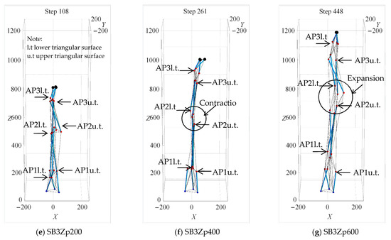 Figure 16 shows the final state for series Zn and Zp in cases of the uni-directional mode. Spine biotensegrity models in series Zn achieved the targets by means of bending or axial deformation or a combination of both. Conversely, spine biotensegrity models in series Zp exhibit solely axial deformation. In series Zn, SB1 and SB2 demonstrate bending deformation with obvious bending about AP2 (Figure 16a,b). The bending deformation is mainly towards the positive y-axis, with the thoracic kyphosis (refer to the initial configuration in Figure 3 and the deformed configuration at the final state in Figure 15b) falling on the opposite side. On the other hand, SB3 demonstrates bending deformation about two axes. Specifically, the segments between AP1 and AP2 demonstrate bending deformation about the y-axis, whereas bending about the x-axis was observed in the upper segments (Figure 16c,d). In series Zp, all of the spine biotensegrity models approach the target through the lengthening of cables resulting in axial deformation. It is noted that the spine biotensegrity models were stacked up with upper cell sunk into the lower cell, forming sag depth at all of the apices (Figure 3). At the initial state, the lower triangular surface of the upper cell (denoted as l.t. in Figure 16e–g) is located below the upper triangular surface (denoted as u.t. in Figure 16e–g). The height of l.t increased and gradually exceeded the height of u.t during the shape change analysis. Such height increment was demonstrated firstly at AP3 (Figure 16e), which is then followed by AP2 and later AP1 (Figure 16f,g), with the increase in target displacement magnitudes. Deformations in terms of contraction and expansion were also observed in both series Zn and Zp.