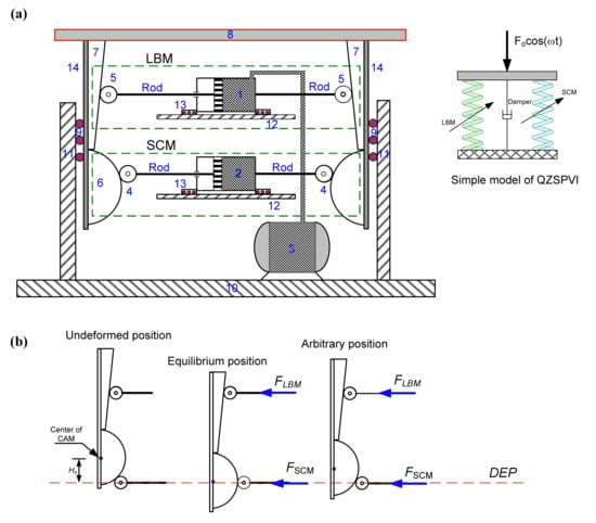 The QZSPVI, which is constructed by a positive stiffness structure connecting in parallel with a negative stiffness one, is described as in Figure 1a. The formerly named load-bearing mechanism (LBM), consisting of the wedges 7, rollers 5, and cylinder 1, is used to support the load plate 8, while the latter is used to correct the dynamic stiffness of the system and is called the stiffness correction mechanism (SCM), including semicircular cams 6, rollers 4, and cylinder 2. It is noted that the wedge 7 and cam 6 are fixed on the leg 14 which is fixed on the load plate 8 and only moves vertically through the guidance bars 11 and rollers 9, meanwhile the rollers 5 and 4 only realize horizontal motion via the rods and cylinders in which the cylinders can only slide horizontally without frictional phenomenon thanks to the sliding on fixed guidance bars 12 of sliders 13. An auxiliary tank 3 connects to the cylinder 1 of the LBM to improve symmetry of the dynamic stiffness curve, and the stiffness of the QZSPVI can offer desirable low values by adjusting the low pressure in cylinders 1 and 2.
