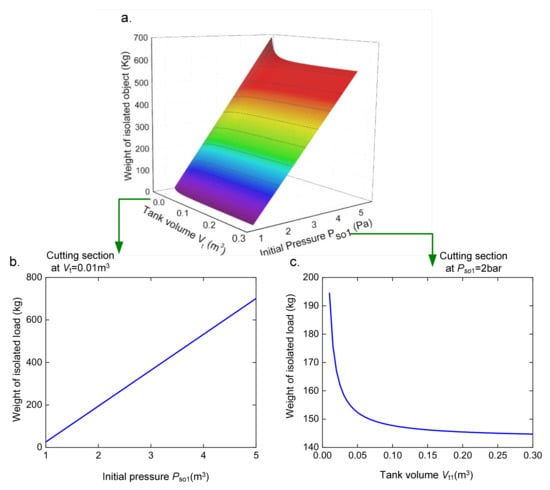 For instance, Ho = 73.5 mm and A1 = 0.0095 m2, through Equations (4)–(6), the relationship between the weight of the isolated load and the initial volume for which the pressure in the cylinder 1 is always higher than one as shown in Figure 2. It can be seen that either increasing the initial pressure or reducing the tank volume will result in an increase in the isolated load. However, the effect of these parameters on the isolated load is different. Specifically, the isolated load is almost increased gradually according to the growth of the initial pressure as observed in Figure 2b, created by a cutting section Vt = 0.01 m3. Meanwhile, the Figure 2c cut by a section at Pso1 = 2 bar indicated that the isolated mass can be remarkably varied, as there is a change of the tank volume in the region of less than 0.05 m3.