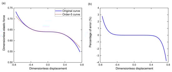 (a) Comparison between of the original (solid line) and 5th order approximated (dot line) curve of the elastic force; (b) The error percentage between the exact solution and approximation one.