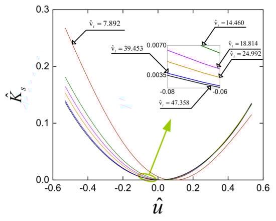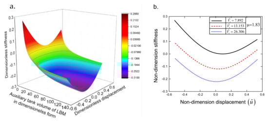 Figure 4a shows the dynamic stiffness surface in the space in which the pressure ratio µ is 1.83, and other parameters include . It revealed that the stiffness of the QZSPVI is strongly affected by the auxiliary tank volume Vt of the load-bearing mechanism. Reducing the value of Vt will increase the value of the system stiffness. Simultaneously, the asymmetric level of the stiffness curve around the equilibrium position is also developed. This is seen clearly in Figure 4b, and created by cutting sections at (types of lines are presented in the top-right corner panel). Furthermore, because of the asymmetry of the stiffness curve, the system can not achieve the lowest stiffness at the equilibrium position (u = 0). As observed, for the 1st dimensionless value of the tank volume, the position defined by at which the stiffness achieving the lowest value is approximated 0.084 and the value of can be reduced to 0.034 and 0.09 as the auxiliary tank volume is grown to 13.153 and 26.306, respectively.