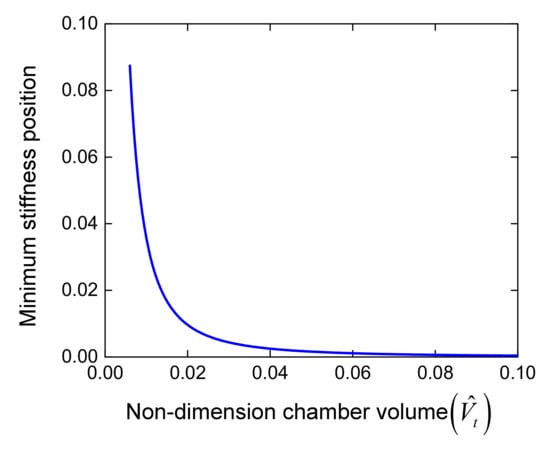 The lowest stiffness position can be predicted by differentiating Equation (9) to second order versus the displacement as expressed in Equation (11), and then it equals zero. It can be seen that this position will be asymptotic to the wanted equilibrium position when the auxiliary tank volume is large enough, as shown in Figure 5.