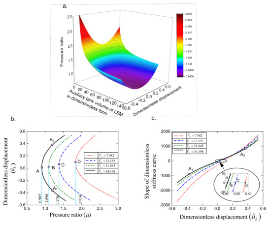 In addition, from Equation (8) for Pe1 = 2 bar, by setting Ks = 0, the relationship between the pressure ratio and the auxiliary tank volume for which the pressure in cylinder of the SCM will be calculated is marked in Figure 6a. The pressure ratio curve is formed by cutting sections at the various values of the auxiliary tank volume as shown in Figure 6b, in which the values of and the notation for line types are noted in the middle of the panel. It can be observed that in the case of , at the extremum point A corresponding to the pressure ratio µ = 0.905, the oscillation system can obtain the quasi-zero stiffness at only one position but µ > 0.905, there may exist two positions at which the stiffness is also nearly equal to zero such as at point A1 and point A2 () for µ = 1.2. It is shown that lessening the volume leads to the increase of the pressure ratio. For instance, , and 7.982, the lowest pressure ratios to obtain quasi-zero stiffness are 1.096, 1.379, and 1.834 are marked by the extremum point such as B, C, and D, respectively. The slope of the stiffness curve at points is nearly equal to zero as depicted in Figure 6c (all parameters are the same as in Figure 6b). Meanwhile, for other positions (A1, A2, etc.) these are nonzero, indicating that for the value of µ at extreme points of the pressure ratio curve, the dynamic stiffness is equal to zero and obtains the minimum value in the expected working region. This result is also confirmed in Figure 7a, herein the values of µ and annotation of the line types are given in the top right corner panel of the figure.