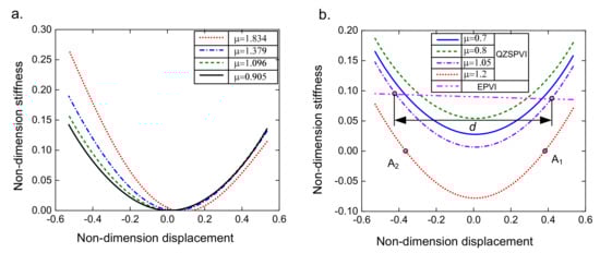 Stiffness curve for different values of µ given in the panel of figure: (a) Quasi-zero stiffness at position ; (b) Arbitrary stiffness.
