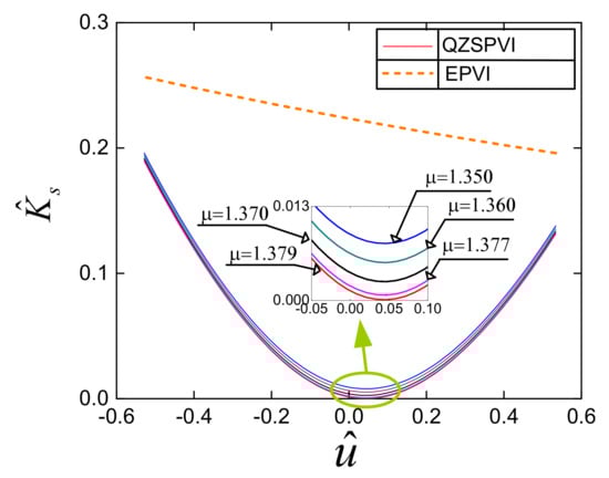 The stiffness curve of the QZSPVI for Pe1 = 1.85 bar, and different values of µ.