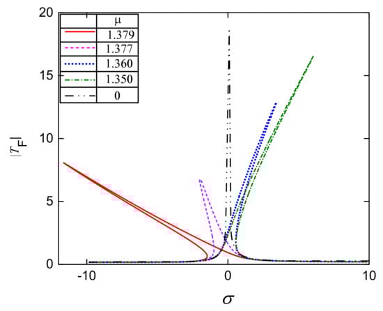As analyzed above, the amplitude–frequency response of the proposed system can be soft or hard depending on the peak frequency σp. Indeed, this value is negative corresponding to the response curve bending to the left. Contrastingly, the bending to the right appeared for the positive value of σp. Figure 11 shows the influence of the pressure ratio on the peak frequency of the QZSPVI for the same parameters as in Figure 8. It is interesting to see that if the pressure ratio is larger than 1.376, the value of σp is negative, indicating that the response curve is bent to the left as confirmed in Figure 9. Meanwhile, the bending of the curve to the right occurred for µ < 1.376 due to σp > 0.