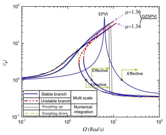 In this section, the effects of the pressure ratio and volume of auxiliary tank on the force transmissibility of the QZSPVI are investigated. Firstly, the pressure ratio will be studied. Meanwhile, a set of parameters of the isolation system comprising of is given, simultaneously at the equilibrium position, the pressure Pep1 of the LBM is set at the value of 1.85 bar, for which the weight of the isolated load is 122.41 kg. As observed in Figure 8, the dynamic stiffness (denoted by the solid line) of the QZSPVI for various values of µ within 1.350 to 1.377 is always smaller than that of the EPVI (exhibited by the dashed line) when the position of the load plate is in the working region (). Especially, when µ = 1.379, the minimum stiffness of the QZSPVI is nearly equal to zero and it will be increased according to reduction in the pressure ratio. The result is the force transmitted curves shown in Figure 9 (the detailed annotation of the type of lines and the chosen values of µ are presented in the left-upper corner panel of the figure). It can be argued that the nonlinearity of the proposed model bends the force transmitted curves to the left or the right depending on the pressure ratio. In the case of µ = 1.379, the curve is bent to the left, indicating that this is the case of the soft nonlinear system. Reducing the pressure ratio will lead to reducing the soft nonlinearity to become the hard nonlinearity. As observed, the amplitude–frequency curve is bent to the right for µ = 1.370. However, the bending level of the response curve to the right may be lessened as there is a lessening in the pressure ratio such as µ = 1.360, µ = 1.350, and even trends no bending for µ = 0, as shown in Figure 9. This is evident because the pressure of the stiffness corrected mechanism will be reduced according to the reduction in the value of µ, meaning that the effects of this mechanism on the dynamic stiffness of the QZSPVI become light, and hence, the peak amplitude is increased. Furthermore, the increase of the pressure ratio will broaden the isolation region of the hardening system toward the low frequency as plotted in Figure 10. On the other hand, the comparison between the proposed system with the EPVI in which the SCM is removed is shown in Figure 10. It is noteworthy to observe that the suppression of the force transmissibility from the load plate to the base of the QZSPVI is better than the EPVI, meaning that isolation region and vibration attenuated ratio of the former is larger than those of the latter.