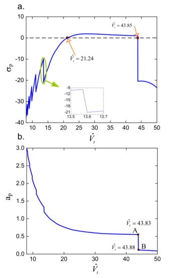 In this case, the peak frequency and amplitude curve, with respect to the tank volume of the QZSPVI having the dynamic stiffness curves shown in Figure 13, is presented in Figure 14. It can be seen that if the dimensionless volume of the auxiliary tank is larger than 21.24 and smaller than 43.85 the value of σp is positive, but this value is negative because the volume of auxiliary tank is out of this range, as shown in Figure 14a. Besides, increasing the tank volume will lead to a lessening in the peak amplitude as observed in Figure 14b, while this may have no appearance in the peak frequency. For instance, with the value of σp is around −10.5, but if , this value is nearly equal to −21. Furthermore, as the dimensionless volume of the auxiliary tank is changed from 43.83 (at point A) to 43.88 (at point B), the value of σp is changed suddenly from positive to negative. Simultaneously, the peak amplitude is decreased remarkably. In addition, it is essential to note that increasing the auxiliary tank volume will extend the region isolation toward low frequency, as shown in Figure 15. This indicates that improving the symmetry of the stiffness curve will increase the effectiveness of suppressing the force transmissibility from the load plate to the base.