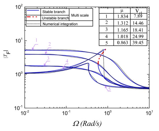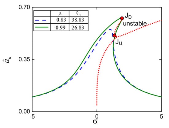 The effect of nonlinearity in dynamic characteristic, the amplitude–frequency curve, can be bent as analyzed above, which indicates the appearance of the down (JD) and up (JU) jump frequency as expressed in Figure 16. Herein, the values of µ and are given in the right-top corner panel, and the other parameters are the same as in Figure 13. The points on the response curve lying between JD and JU are unstable solutions because these points are in the unstable region calculated by Equation (34). When the down jump frequency which is also the peak frequency σp moves closely to zero, the phenomenon of the frequency jump may be neglected, meaning that all points on the amplitude–frequency curve are stable as numerically simulated by the dashed line in Figure 16. Likewise, the stable branches of the proposed model with various values of µ and are denoted in Figure 10 and Figure 15. The detailed annotation for line types is presented in the lower-left and upper-left corner of Figure 10 and Figure 15, respectively.