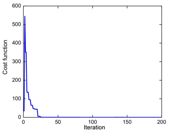 Then, genetic algorithms, including three operations—reproduction, crossover, and mutation, as shown in Figure 18, are employed to determine optimal values of the friction model given in Equation (39). This work aims to minimize the cost function expressed by Equation (41). As observed in Figure 19, after 30 iterations, the cost function converges to zero.
