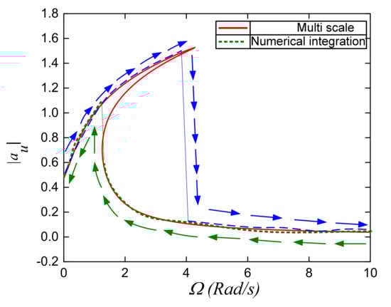 First of all, the amplitude–frequency curves obtained by multi-scale method and fourth-order Runge–Kutta algorithm are compared, as shown in Figure 21. Herein, the frequency of the excited force is swept up slowly from 0 to 10 Rad/s (denoted by the dashed line). In contract to slowly reducing the frequency of 10 Rad/s to 0, the amplitude–frequency curve is exhibited by the dot line. It can be seen that although the down jump point has a difference between two methods due to approximate error and exiting sliding friction between the piston and cylinder, two curves are still in good agreement.