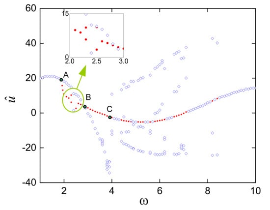 Next, the complex behavior of the proposed system will be investigated through the numerical integration for Equation (42) using a fourth-order Runge–Kutta algorithm with various initial conditions, including velocity and position. The bifurcation diagram of Equation (42) for µ = 1.834, ω changed from 1 to 10 rad/s and the same other parameters as in Figure 8. The value of is determined by using Poincare map with the period T = 2π/ω. The simulated result is plotted in Figure 22, showing that if the initial condition is zero for both of the position and velocity, the dynamic response of the system (denoted by filled circles) will be period-2 oscillation as the excited frequency is within 2.2–2.6 rad/s. However, out of this range the solution is period-1 periodic. Meanwhile, the response marked by squares is realized by sweeping the parameter ω from 1 to 10 rad/s, for which the initial position and velocity are set at zero only for the first parameter ω and the final state of the system will be considered as the initial condition for the next value of ω. In this case, the oscillation transformed from period-1 to period-3 periodic occurred with ω around of 4 and 8 rad/s. Hence, it revealed from this figure that depending on the initial condition, the dynamic response of the system can be bifurcated at A (1.9 rad/s), B (2.8 rad/s), and C (4 rad/s), meaning that in the parameter ω < 1.9, only a period-1 solution exists, but 1.9 < ω < 2.8 two cases for two period-1 or period-2 solutions may appear. However, if the parameter is within B and C, there are two cases for period-1 periodic oscillation, and after C the dynamic behavior of the system can be a period-1 or period-3 solution.