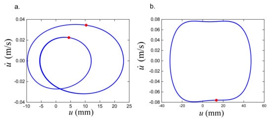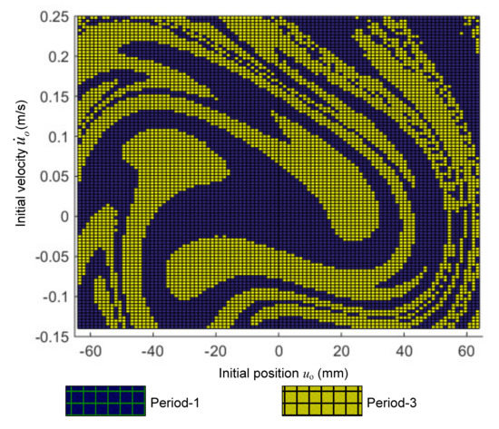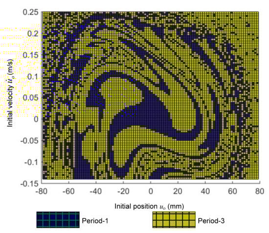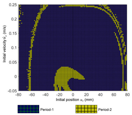 Furthermore, in order to obtain the solution of the dynamic response, the family of the initial conditions named the attractor–basin phase portrait affecting on the dynamic response will be detected in the three cases following. In the first study case, the parameter ω is taken account into at value of 2.4 rad/s, while other parameters are simultaneously set as in Figure 22. As shown in Figure 22, it can be seen that the period-1 or period-2 solution may exist depending on the initial condition. It is interesting to see that in the attraction basin depicted in Figure 23, the attractor region of the period-1 oscillation is greater than that of the period-2 one. This means that the ability to obtain period-1 steady dynamic response is higher. Additionally, the vibration ability of the period-1 oscillation plotted in Figure 24b is higher than that of period-2 one depicted in Figure 24a, in which the initial position and velocity of the first solution is zero but the second one is obtained for meanwhile, the fixed points calculated by Poincare section are annotated by filled circles.