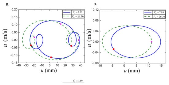 Phase orbit of Equation (42) for ω = 2.4 rad/s and (a) (b).