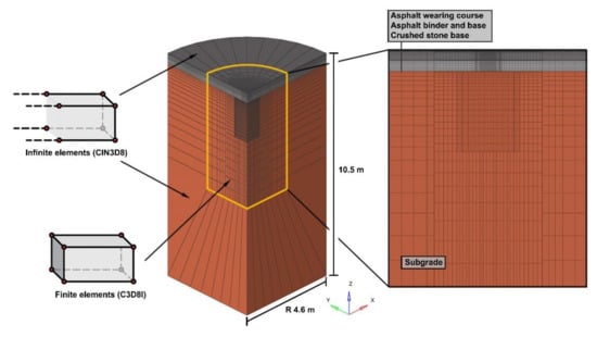The finite element model (Figure 2) prepared for this research study consisted of a cylindrical domain of the road pavement structure, where there were C3D8I (8-node linear) finite elements, surrounded, at the boundary in the radial direction, by CIN3D8 (8-node linear) infinite elements; additionally, at the bottom of the subgrade below, we considered there to be a transition into infinite elements (to control the size of the depression). In ABAQUS software, at the definition of infinite elements, the numbering of nodes needs to be considered, because only the first surface of an infinite element can be interconnected to the finite element mesh. Edges starting from boundaries head toward the direction considered as infinite and are located around a pole. According to the theory, the solution for the infinite space is approximated along these edges, while the elongations of these edges within the boundary meet in a pole.