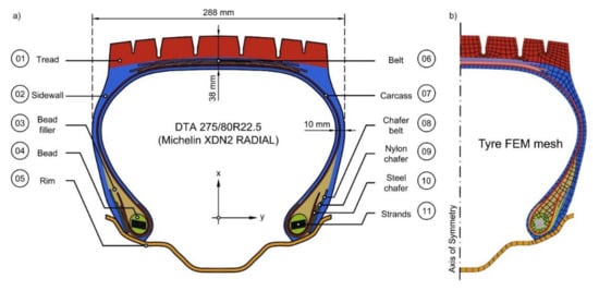 The cross-section of the tyre model in Figure 3a reflects the state before the inflation and the nesting onto the body of the wheel. The interaction between the body of wheel and the tyre was worked out based on the tear analysis of the rebar published by [].
