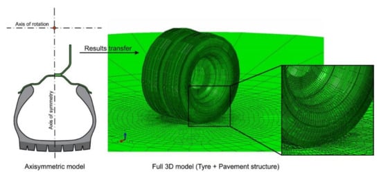 The tyre–pavement interaction can be successfully analysed by the finite element method at the present level of computing technology, instead of expensive and time-consuming in situ or laboratory measurements. This topic is well documented in the former studies [,,,].