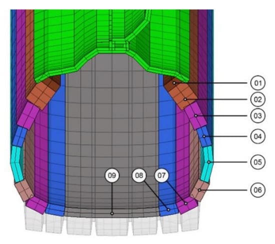 In the case of a composite shell element, the material parameters and grainline were defined in a cylindrical coordinate system, assigned to the tyre model. Table 5 shows the layer structure of element groups, where the order of layers started from the inner wall of the tyre and advanced outwards. Figure 5 and Figure 6 illustrate the shell element groups and the layered structure. The tread out of continuum elements was associated with the material property of tread rubber (Table 4).