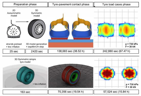 Comparing the working of the two different tyre models and the running times required for each simulation step, the observations showed that the largest difference could be found in the preparation phase. The running time of the preparation phase of the simple tyre model was 15-fold quicker than that of the complex model. The running time for each simulation phase shown in Figure 8 was equal to the total processing time (CPU time). That means that, if the simulation ran on more processor cores, the running time would have decreased proportionally. According to Figure 8, the elaboration of one contact simulation, applying the complex model, requires, in total, about 107 CPU hours (at 22 threads, about 4.9 h). After the first preparation phase and interaction simulations, it was possible to alter the load and the tyre pressure, which means that the result of another experimental condition could be reached in 67.4 CPU hours (at 22 threads, about 3 h). In the case of the simple tyre model, the elaboration of the contact simulation required, in total, 35.4 CPU hours (at 22 threads, about 1.6 h). In the case of any further modification of the load and the tyre pressure, the simulation time decreased to 15.8 CPU hours (at 22 threads, about ¾ of an hour). This means that the simulation time applying the simple model was less than ¼ of that of the complex model.