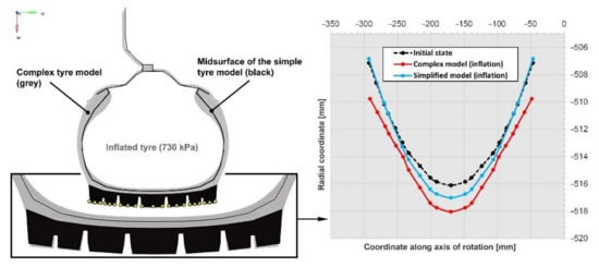In the inflation process of the tyre models, it could be observed that the tight surface in the complex model first lay on and tightened to the rim of the body of wheel and, afterward, it tumbled over. The current, simple model was not able to describe this deformation process; consequently, the deformation of the sidewall was not the same during inflation. The treads of the two models show nearly the same deformation; however, looking at Figure 9, it can be observed that the tread rims of the simple model moved on a larger arc, which means that the middle of the tread received a higher part from the axle load.