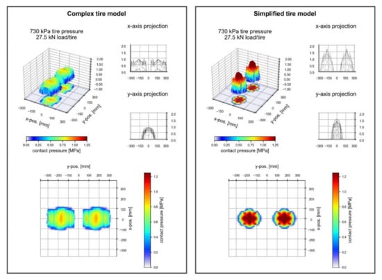 Differences between the two finite element tyre models were analysed at various tyre pressures and axle loads according to Table 6. The results consist of stresses in structures as well as contact areas and contact stresses of the tyre on the pavement, reflecting closely the results in the literature [,].