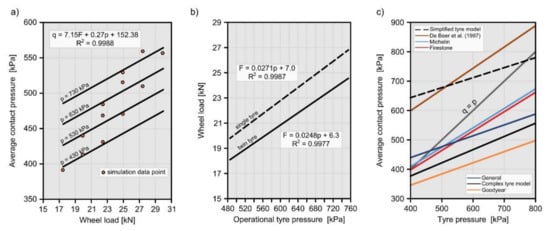 Considering the fact that tyre manufacturers provide values of allowable inflation pressure and wheel load for operation, Equations (7) and (8) can be further simplified (Figure 11b). The connection between the allowable wheel load and the inflation pressure of the tyre can be described by a linear function, according to the manufacturers’ data (R2 = 0.99):