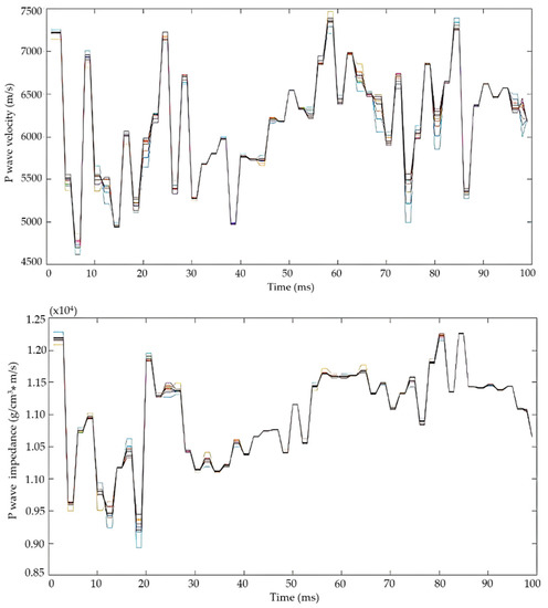 Through the inversion of the whole particle swarm, the evolution factors are estimated, and the convergence state is judged. We take some optimal solutions from all the particles, and the single-channel multi-particle inversion results are shown in Figure 4, One is the result of compressional wave inversion, the other is the result of compressional wave impedance inversion. Although the inversion results are inconsistent in the particles, the particles of these optimal solutions are close to each other in the search space, and the inversion results are consistent with the rock physics model.