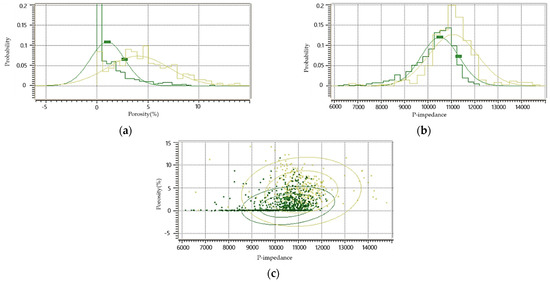 (a) Gas and non-gas porosity histogram, (b) Gas and non-gas P-impedance histogram, (c) Cross-plot of Porosity and impedance of gas and non-gas layer.