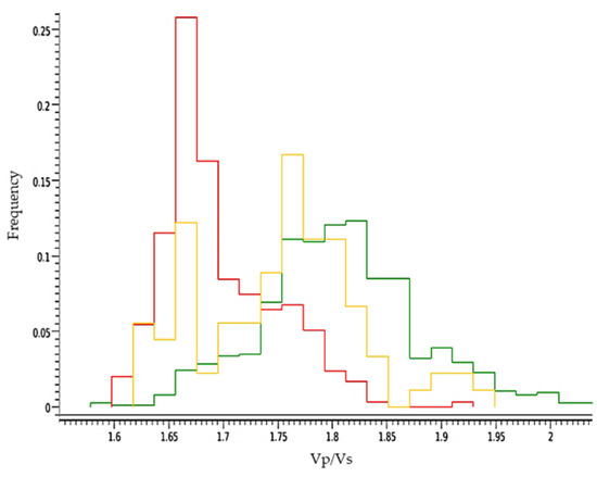 Vp/Vs histogram among gas-layer (red), non-gas layer (green), and target layer (yellow).