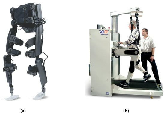 With EksoGT [48] (formerly eLEGS) (Figure 2a), various analysis evaluations and training for the lower limb in neurorehabilitation on paraplegic subjects [48,49,50] were carried out, using the active powered exoskeleton as a test bench. The clinical trials yielded positive results that are safe, practical, and with minimal risk to secondary injuries and patients with incomplete SCI. However, a limitation of the design is the lack of experimental methods for demonstrating the relative effectiveness of the exoskeleton in comparison with other rehabilitative techniques and technologies. An improved version of the EksoGT is the EksoNR [51], which assists in regaining natural gait patterns by re-teaching the human brain and muscles how to walk again after healing. It means the variant has been integrated with sensors to monitor the movement intent of the leg continuously.