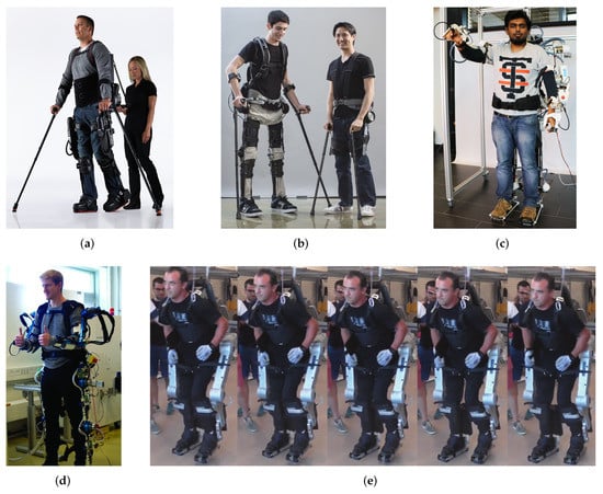 Medical application exoskeletons. (a) EksoGT™by©Ekso Bionics. (b) Phoenix (photo credit: SuitX). (c) Recupera-Reha (photo credit: Meltem Fischer, DFKI). (d) AXO-SUIT (copyright credit: Shaoping Bai, Aalborg University). (e) The ATALANTE lower limb exoskeleton with free hands during walking experiments with a paraplegic patient (photo credit: Wandercraft).