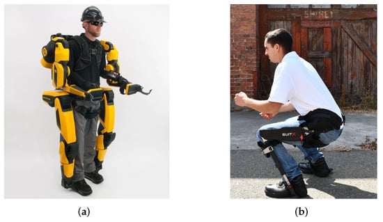 Industrial application exoskeleton. (a) Guardian XO Alpha (photo credit: Sarcos Robotics). (b) LegX (photo credit: SuitX).