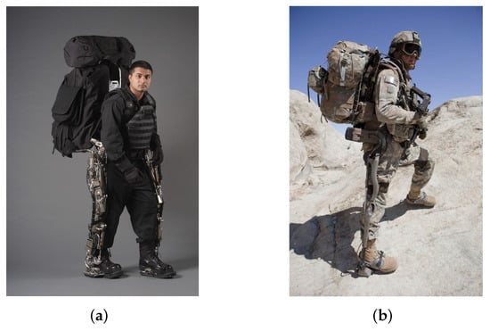 Military application exoskeleton. (a) BLEEX (photo credit: Berkeley Bionics). (b) HULC (photo credit: Lockheed Martin).