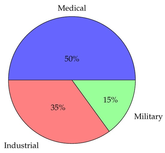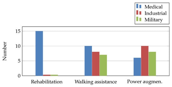 The classification of LEEs based on the application domain is presented in this section. The LEE robots for bipedal walking are classified into three applications: medical, industrial, and military. Additionally, the variations among the application domain with regards to dominance in the existing designs are highlighted.