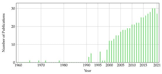 The histogram in Figure 7 depicts the distribution of the reviewed papers by publication year. It corresponds to the number of exoskeletons developed based on application over 60 years. Only some selected articles that are relevant to our work are included. We consider the development year of the exoskeleton designs for the three categories: In 1965, the first gait assistance exoskeleton was developed. In 1972 and 1978, respectively, a new design similar to the first design was developed. There was a dormancy period between the late 1970s and 1980s. A climax period that attracted the market began in the early 2000s, with progressive growth in the designs.