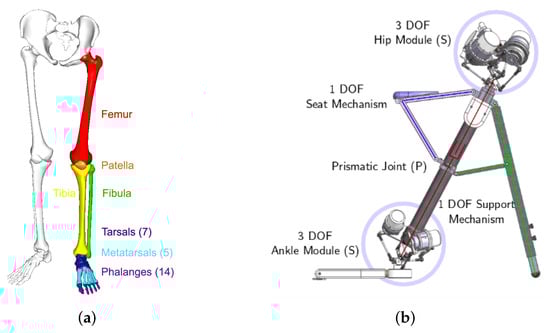 The Recupera-Reha LEE in (Figure 8b) is a prototype designed to mimic the anatomy of the human lower extremity. The three joints SPS module corresponds to the three joints (SRS) of the human leg in (Figure 8a). The LEE of Recupera-Reha consists of modules representing hip (S), ankle (S), and a prismatic joint (P) connecting the hip and ankle joints with an extension from the hip, which supports sitting mode [28]. The Recupera-Reha ball and socket joint of the hip and the functional hinge joint of the ankle are both designed and treated as an almost spherical parallel mechanism (ASPM), which was introduced in [99] and later extensively analyzed in [100,101]. Due to its complexity, the placement of the joints at an exact center of the pelvic and foot respectively defines the geometry of the human anatomy as a unique design [28,101]. The motor actuators placed at the joints replace the muscle functionality in humans, while the number of actuators placed at each joint determines the directions of motion.