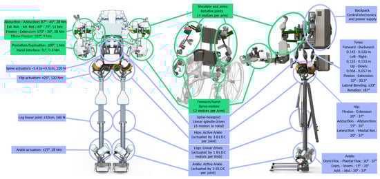 In the past decade, LEEs were designed as series, parallel, or series-parallel hybrid mechanisms [97]. The former is built with kinematic chains arranged in a single series of links and joints while the latter is built by at least two kinematic chains mostly in closed loops [113]. Serial designs are known for their versatility, ample workspace, simple modeling, and control. Their drawbacks include their limited precision, low stiffness, poor dynamic characteristics, and limited speed and torque. In contrast, the parallel counterpart provides higher stiffness, speed, accuracy, and payload capacity. However, they have reduced workspace and complex geometry, which requires careful control analysis as a downside. Regarding an application point of view, the safety and comfort of the wearers of the exoskeleton come first in robot designs. Mimicking the human anatomic motions and augmenting muscle power comes next. For enhancing safety, the mimicking of the human gait pattern, a combination of both serial and parallel designs, has been employed recently, and is still ongoing, aiming for functionality that is almost closer or equal to that of a human (see Figure 9) [28]. The Recupera-Reha full-body exoskeleton in Figure 9 with two system design configurations; the full-body (left) and wheelchair design mode (right), is a combination of series-parallel (hybrid) designs. The blue highlighted labels represent the full-body system features while the green highlighted labels represent both system designs. The modules for the upper-limb has a link of serial chains at the forearm and elbow joint connected to the wrist. The joints are actuated with serial elastic actuators and are implemented as independent series kinematic chains. The shoulder joint is a parallel mechanism design that provides a large workspace and prevents collision with the human head due to the placement of the actuators behind the shoulder blade (details in [114]). The lower-limb has its hip and ankle joints treated as an ASPM modular design (more details in [101]). Each of the modules of the upper and lower-body are independently coupled, making the full-body a combination of a series-parallel (hybrid) design.