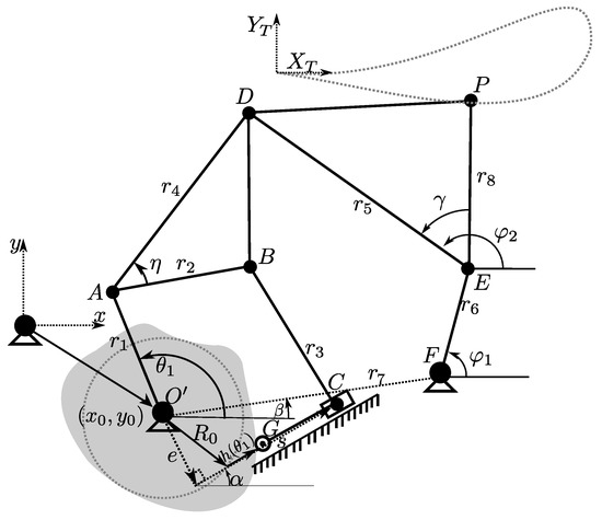The second optimization problem is the synthesis of a cam–linkage mechanism. The design problem was presented by Shao et al. [22]. The conceptual model for the cam–linkage mechanism is shown in Figure 5, where are the link lengths; , are related to angular displacements; is the Cartesian position of the mechanism with respect to the coordinate system; e and the angle define the displacement position of the slider.