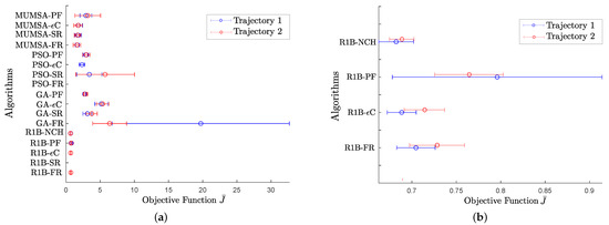 Table 5 shows the descriptive statistics of samples for study case 1 using trajectory 1 in the synthesis process. The columns are related to the analyzed algorithm, the descriptive statistics metrics, and the NFS for each sample. Boldface indicates the minimum value for each column. According to the results in Table 5, all metaheuristic algorithms find feasible solutions through the thirty executions (see NFS metric). R1B-NCH, R1B-SR, and R1B-PF obtain the three best solutions in that order (see column “min”). R1B-NCH gives the best algorithm performance finding solutions. The obtained solution in R1B-SR and R1B-PF presents an increment of and , respectively, with respect to R1B-NCH (see column “min”). In addition, the mean and minimum results are less in R1B-NCH than other algorithms, and the standard deviation, the median, and maximum values present an average behavior.